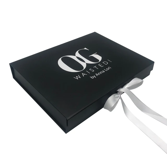 Custom luxury white magnet flap clothing paper box foldable magnetic closure gift boxes with black ribbon